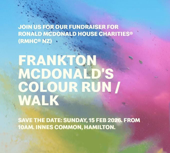 The Frankton McDonald’s Colour Run is a fun, family-friendly 4 km run or walk around Hamilton Lake. Set off from Innes Common and wind your way around a scenic loop, passing through colour-stations along the route where bursts of coloured powder add fun and excitement to the course.